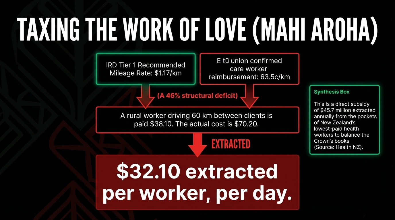 The tikanga violation: Mahi aroha — work done from love, from obligation to community, from the deep structural caring that holds whānau together — is sacred. It is the foundation of Māori social life. When a state turns mahi aroha into a subsidy it extracts from workers rather than funds, it does not just exploit labour. It commits a tikanga violation with a dollar figure attached. It takes the love of a people and turns it into a line item on a balance sheet.
