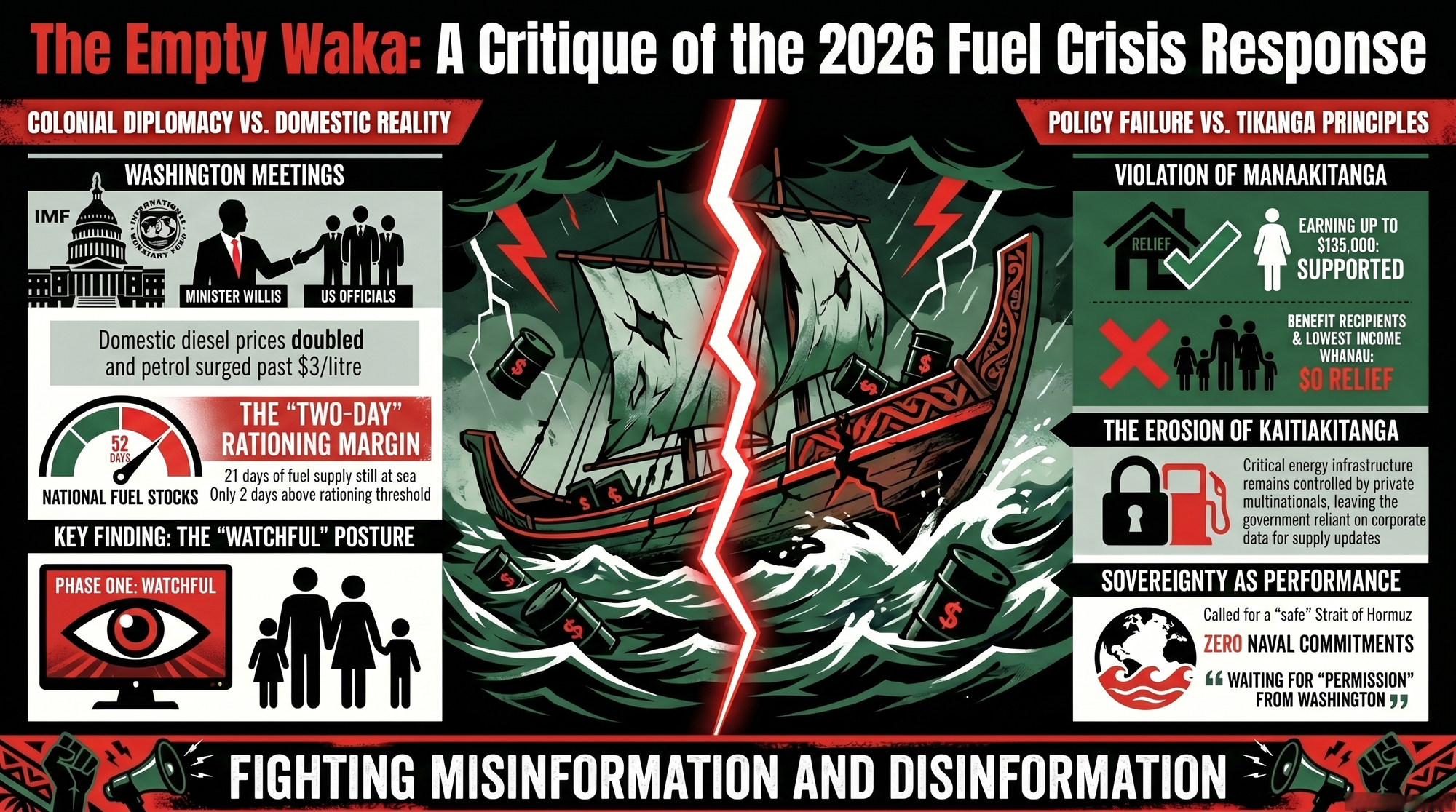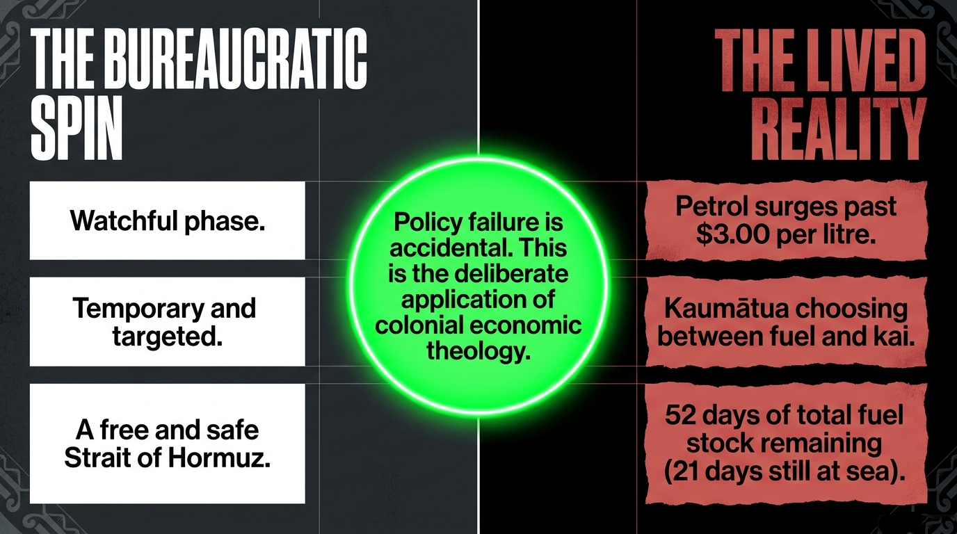 Rangatiratanga demands a Finance Minister who names who is being harmed, taxes those profiting from the harm, and acts with the speed and decisiveness that a 52-day fuel stock and a $3 petrol price demand. What we have instead is a hollow vessel — polished, plausible, and profoundly empty — pointing at maps, quoting geography, and promising candour while the pātaka ash falls on the whānau who built it.