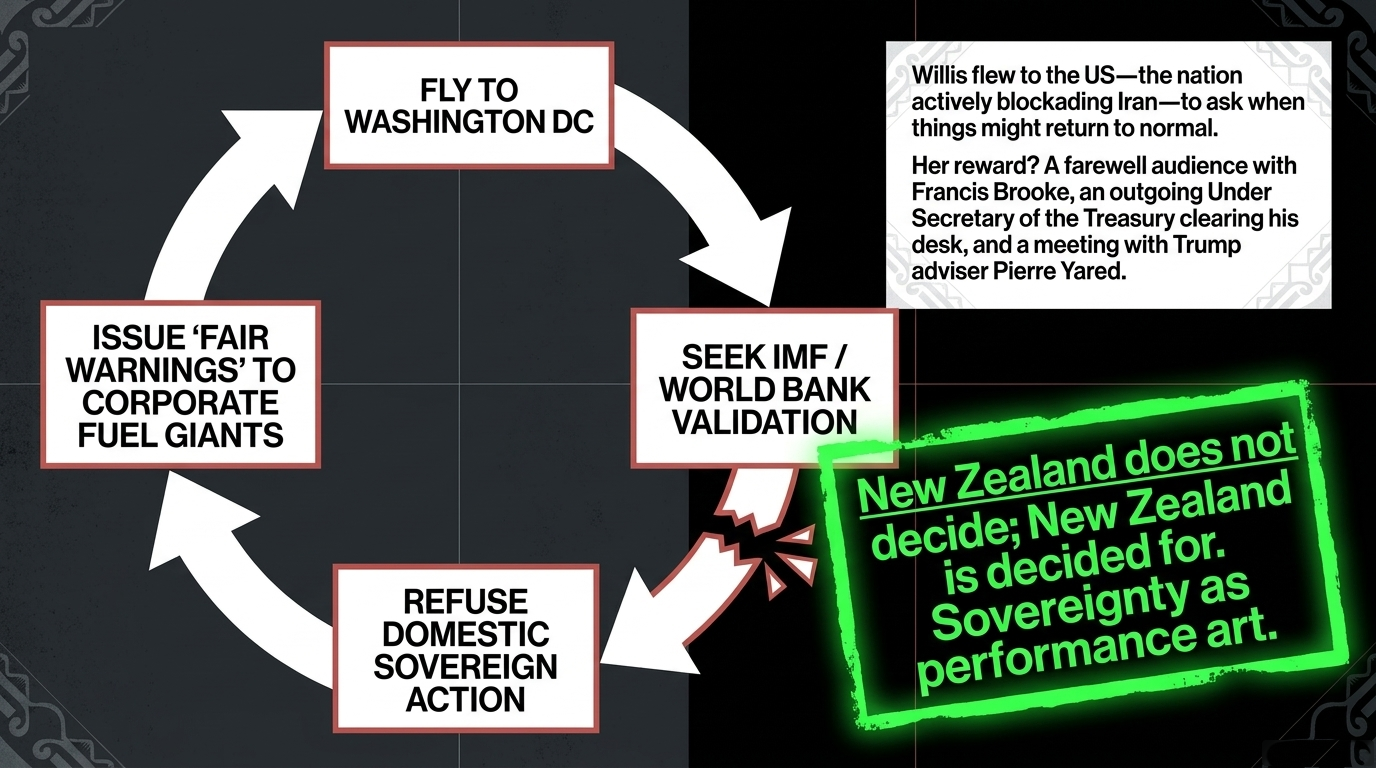 Nicola Willis flew to Washington to beg the empire for good news. She got a farewell audience with an outgoing official and flew home. She called it diplomacy. She declared the Strait of Hormuz "concerning." She put New Zealand on Phase One: Watchful. She gave fuel companies a polite warning. She refused to cut excise. She refused the windfall tax. She excluded benefit recipients from support. She invoked a South Auckland wahine to justify excluding her.