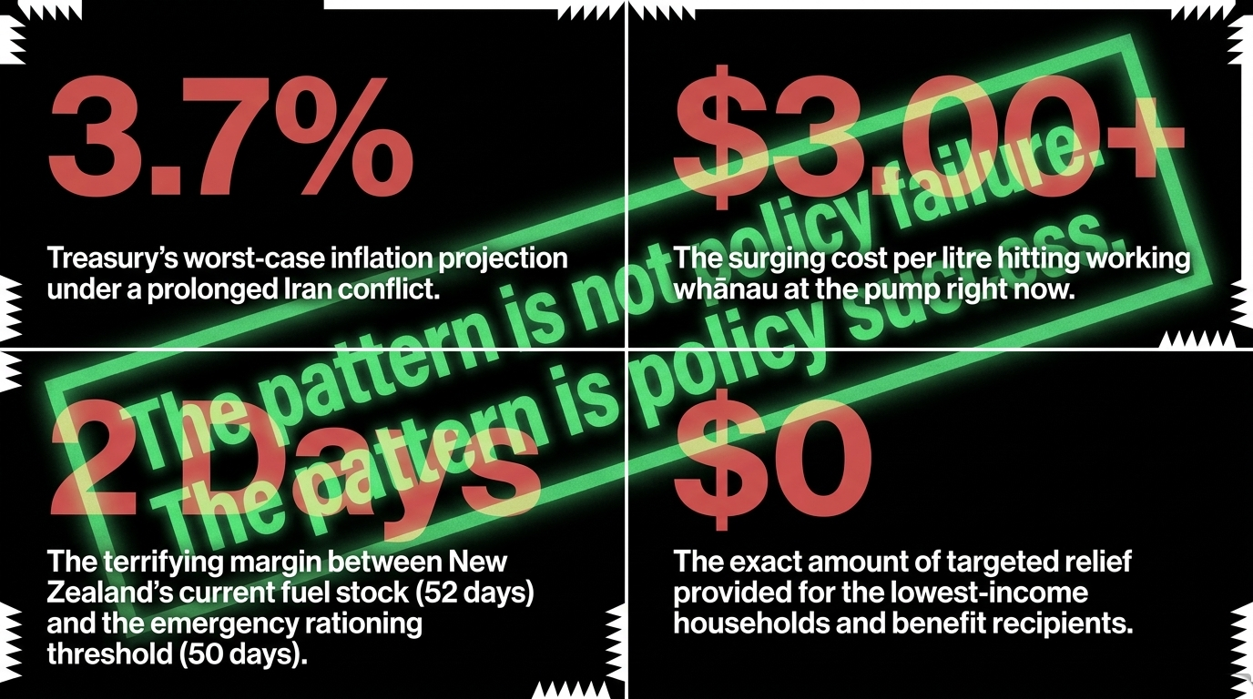 The fuel excise refusal is the most revealing decision in Willis's entire crisis response. As Chris Lynch Media confirmed, officials advised against cutting excise because it would "encourage people to use more of something." Working whānau who drive to their cleaning shift at 5am are not making lifestyle choices about fossil fuel consumption. They are surviving. Willis's logic is a middle-class luxury dressed as environmental concern — the language of someone who has never calculated whether they can afford to drive to work this week.