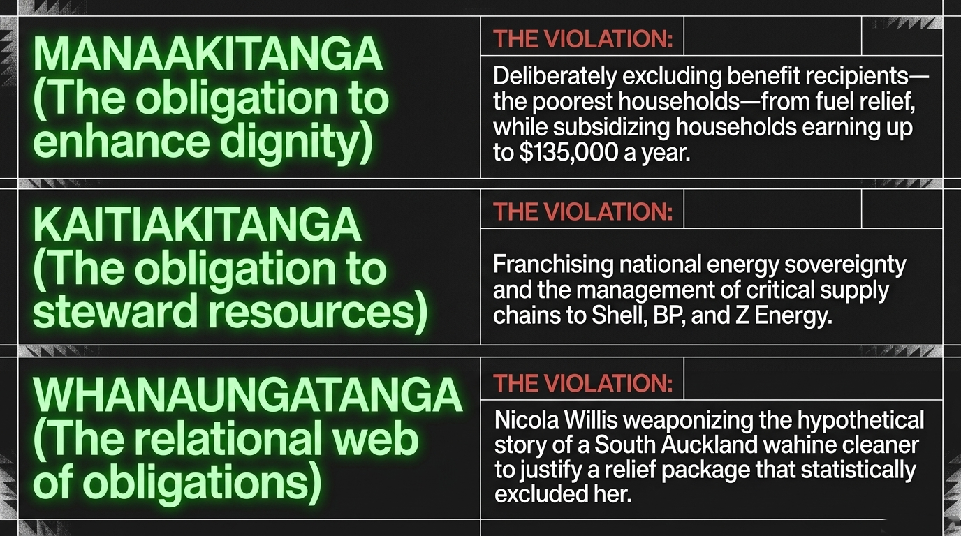Manaakitanga — the obligation to enhance the dignity of others, especially the vulnerable. Willis's fuel relief support package was deliberately designed to exclude benefit recipients — the poorest households in the country, disproportionately Māori and Pasifika — while extending assistance to families earning up to $135,000 a year, as the Māori Green Lantern exposed in The Pātaka Is Ash. That is not a policy error. That is the precise inverse of manaakitanga — it is mana destruction by design, encoded in regulation.