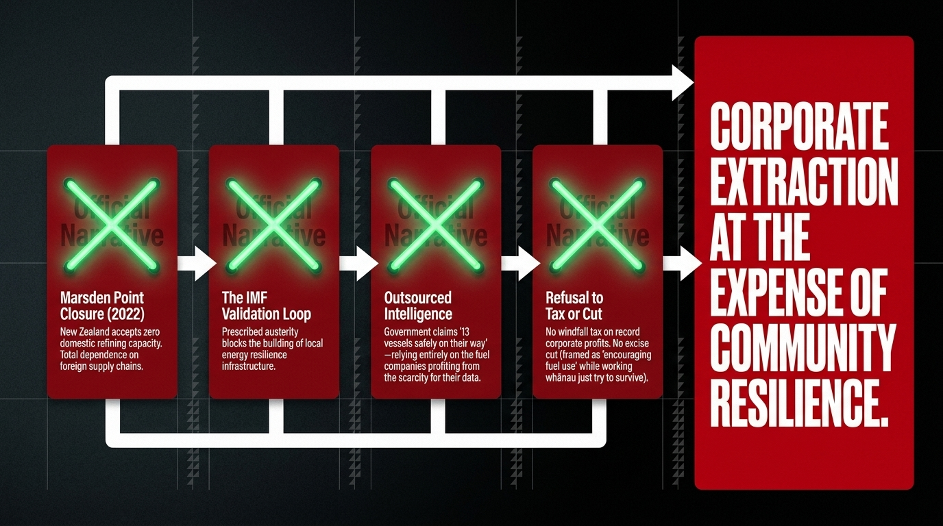 Connection Three — Corporate Information Asymmetry. The government's fuel security intelligence comes from the companies that profit from scarcity. As Chris Lynch Media reported, Channel Infrastructure — which operates New Zealand's largest fuel import terminal — told officials "shipments are continuing to arrive and depart as scheduled." The state is dependent on a private corporation's self-reporting to know the status of national energy security. This is not a glitch. This is the system working exactly as neoliberal architecture designed it to work.