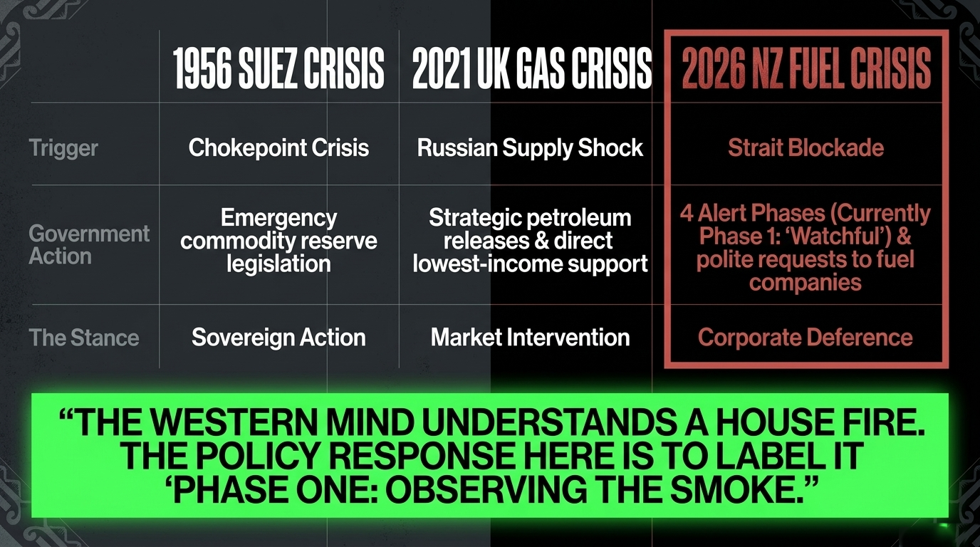 Example One — The Suez Crisis, 1956. When Britain and France colluded to seize the Suez Canal, New Zealand faced an analogous supply chain shock and governments of that era moved swiftly to legislate emergency commodity reserves. Willis, facing a functionally identical scenario — a chokepoint crisis at the Strait of Hormuz driving fuel costs across the entire Pacific supply chain — introduced four alert phases and called the first one "Watchful." As confirmed by 1News, Phase One means the government is observing. Watching. That is the policy. The western mind understands a house fire. The official response to this fire is to label it "Phase One: Observing the Smoke."