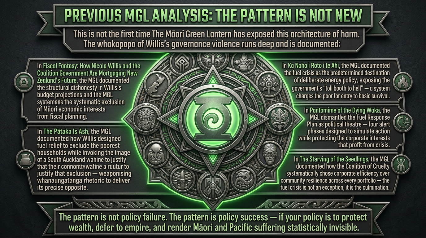 In The Pātaka Is Ash, the MGL documented how Willis designed fuel relief to exclude the poorest households while invoking the image of a South Auckland wahine to justify that exclusion — weaponising whanaungatanga rhetoric to deliver its precise opposite.