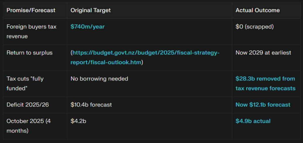 The foreign buyer tax that was supposed to fund those cuts? Scrapped in coalition negotiations with NZ First before the government even took office. The fiscal hole left behind? Still gaping.