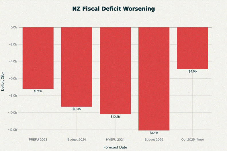 the government’s finances are worse than expected, again. The deficit for the four months to October 2025 hit $4.9 billion—$700 million higher than Finance Minister Nicola Willis forecast in May’s Budget. Including ACC costs, the deficit reaches $5.2 billion, which is $439 million above forecast.