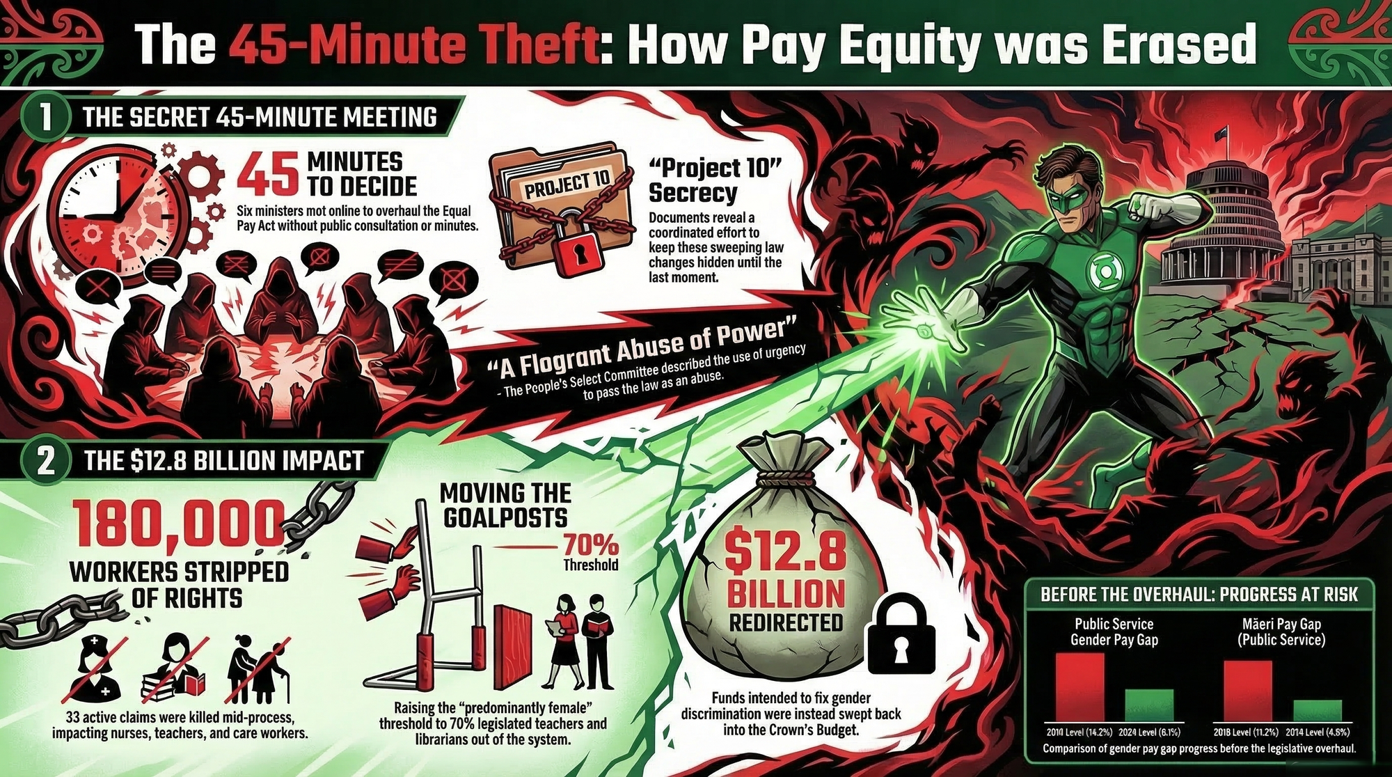 - "Project 10" — the law was deliberately hidden — RNZ's investigation revealed documents showing how the government actively worked to keep the pay equity changes secret until the last possible moment — naming the concealment operation "Project 10." It was not oversight. It was a plan.