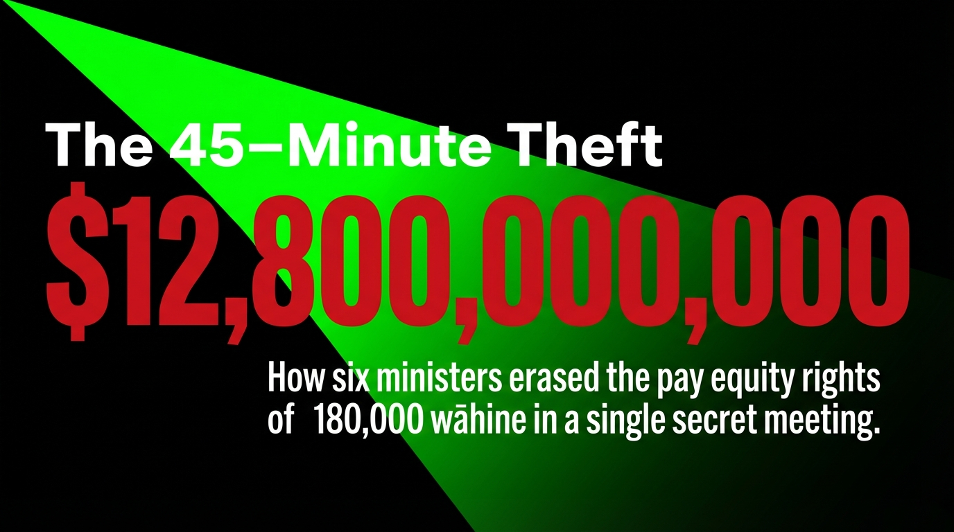 In forty-five minutes on a Zoom call, six ministers of a government with no electoral mandate for this change cancelled 33 active pay equity claims, extinguished the rights of 180,000 workers, removed the legal mechanisms that made future claims possible for the most vulnerable workers, and redirected $12.8 billion away from the wages of wāhine — with no Regulatory Impact Statement, no consultation, no transparency, and no notes they will release.