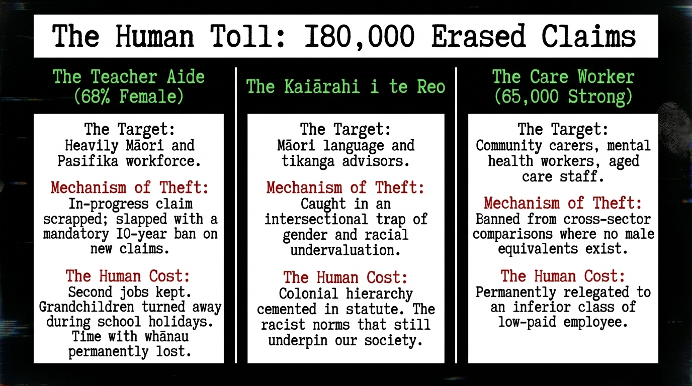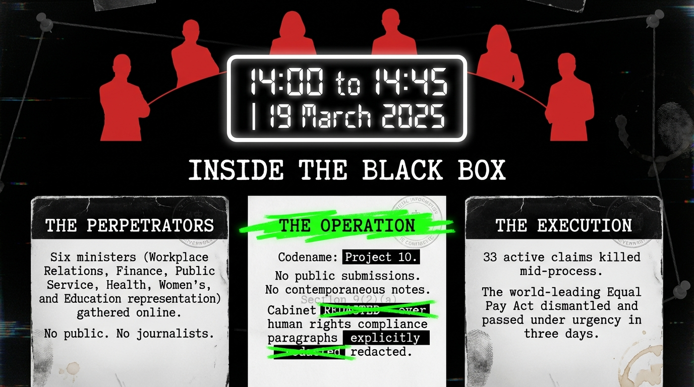 On the afternoon of 19 March 2025, six ministers of the Crown gathered on a screen. No journalists. No public. No contemporaneous notes anyone will release. In forty-five minutes, they erased the pay equity rights of 180,000 workers — the majority of them women, disproportionately Māori and Pasifika — and swept $12.8 billion back into the Crown's operating balance. They did not call it theft. They called it fiscal responsibility. This essay calls it what it is.