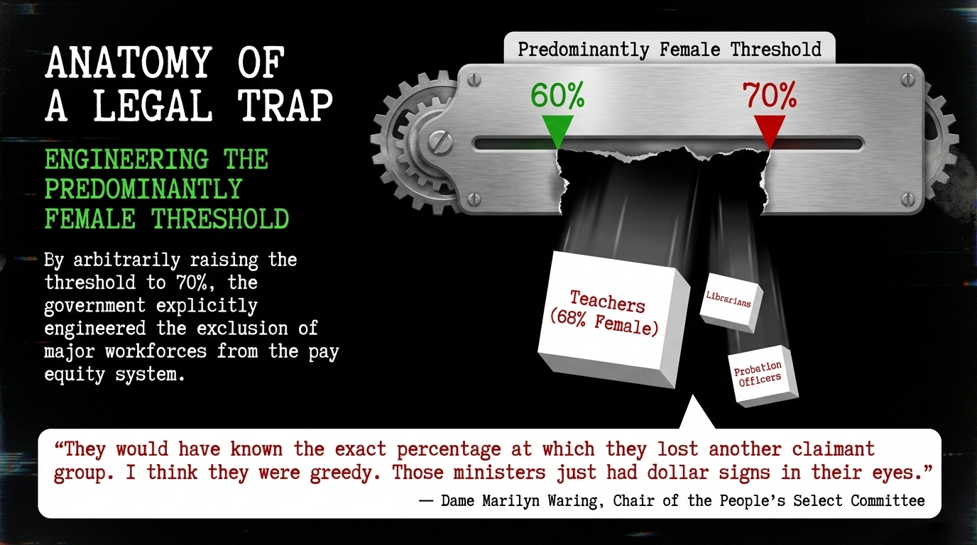Let us be precise about what happened in that Zoom room. Ministers raised the threshold defining "predominantly female" work from 60 percent to 70 percent. This single number — chosen with surgical precision — legislated teachers (68 percent female), librarians, and probation officers out of the entire system. As RNZ reported, NZEI believed this was deliberate: