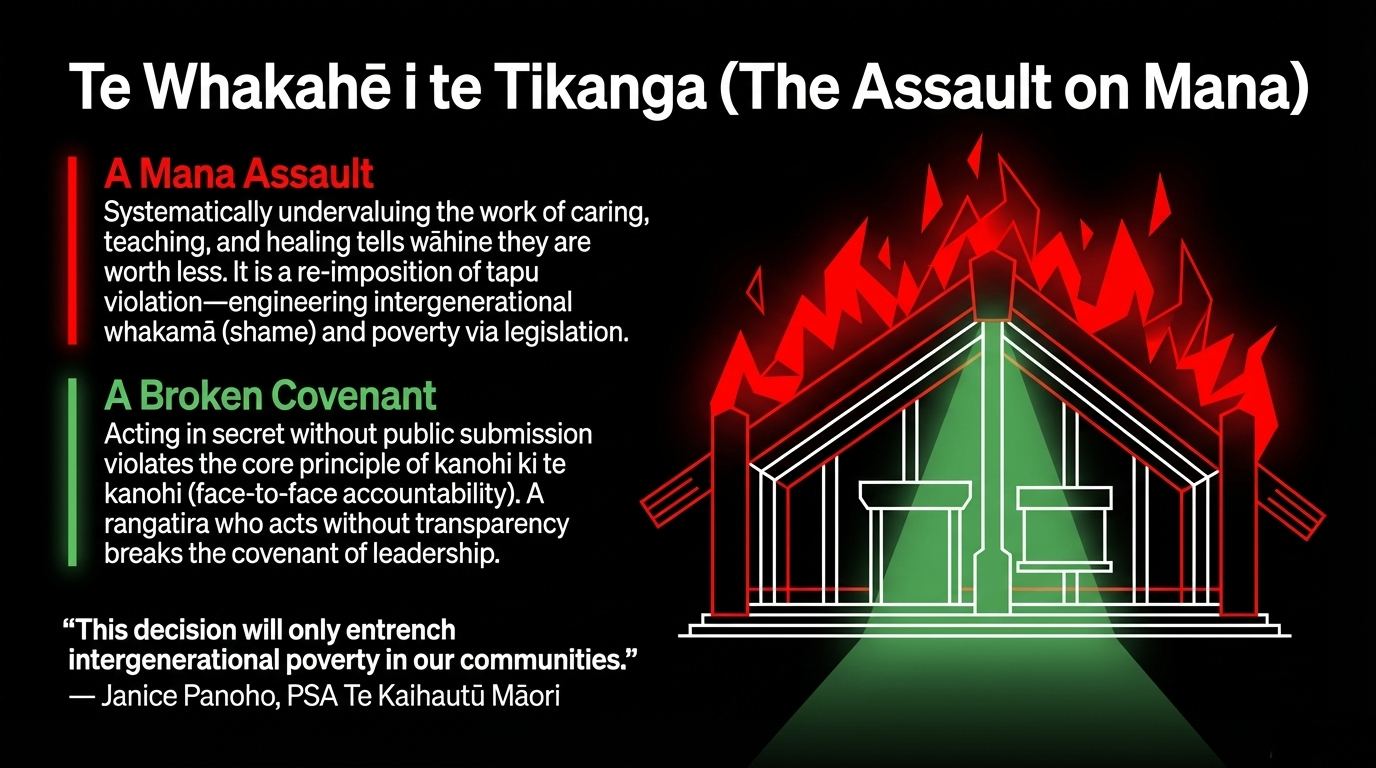 The Crown's Equal Pay Act was, in tikanga terms, a partial act of utu — a restoration of balance after generations of structural devaluation. To cancel it is not merely a policy reversal. It is a re-imposition of tapu violation — a declaration that the mana of wāhine can be overridden by a spreadsheet.