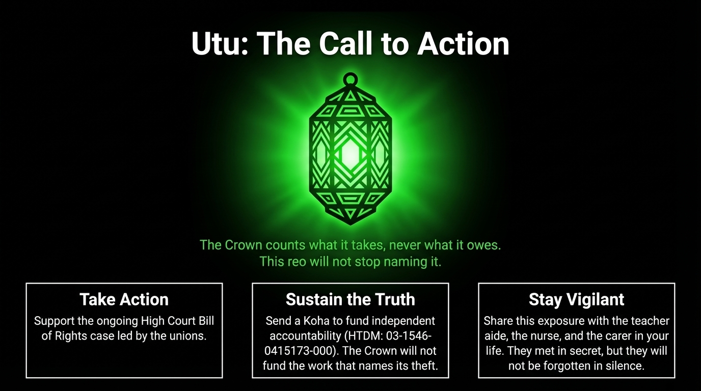 If koha is not possible right now — no worries, whānau. Share this essay with the teacher aide, the nurse, the carer in your life. Send it to every person who deserves to know their rights were erased in a 45-minute meeting with no notes. That sharing is koha. That truth-spreading is the work. Kia kaha. Stay vigilant. Stay connected. They met in secret — but they will not be forgotten in silence.
