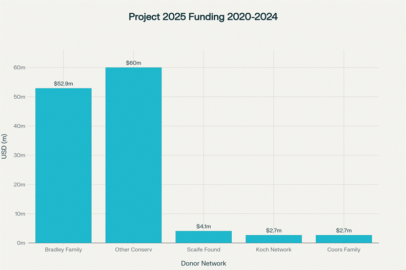 Billionaire Wealth Networks Funding Project 2025 (2020-2024). Ultra-wealthy families invested over $123 million USD to reshape American federal government policy and Christian nationalism, with international influence.