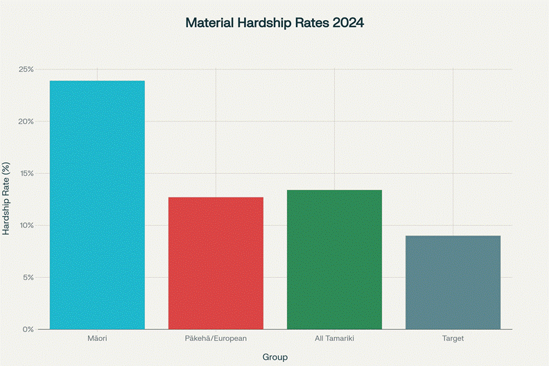Material Hardship Rates Among Tamariki (Children) in Aotearoa New Zealand, 2024. Tamariki Māori experience material hardship at nearly double the rate of their Pākehā peers.