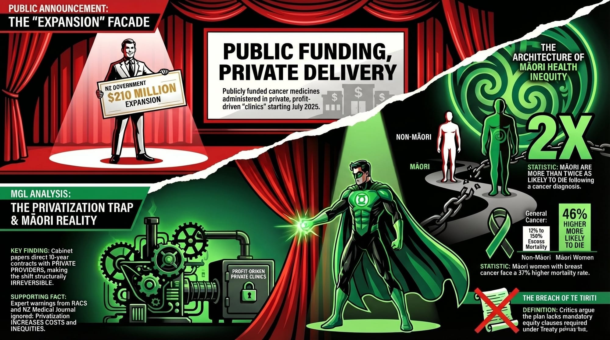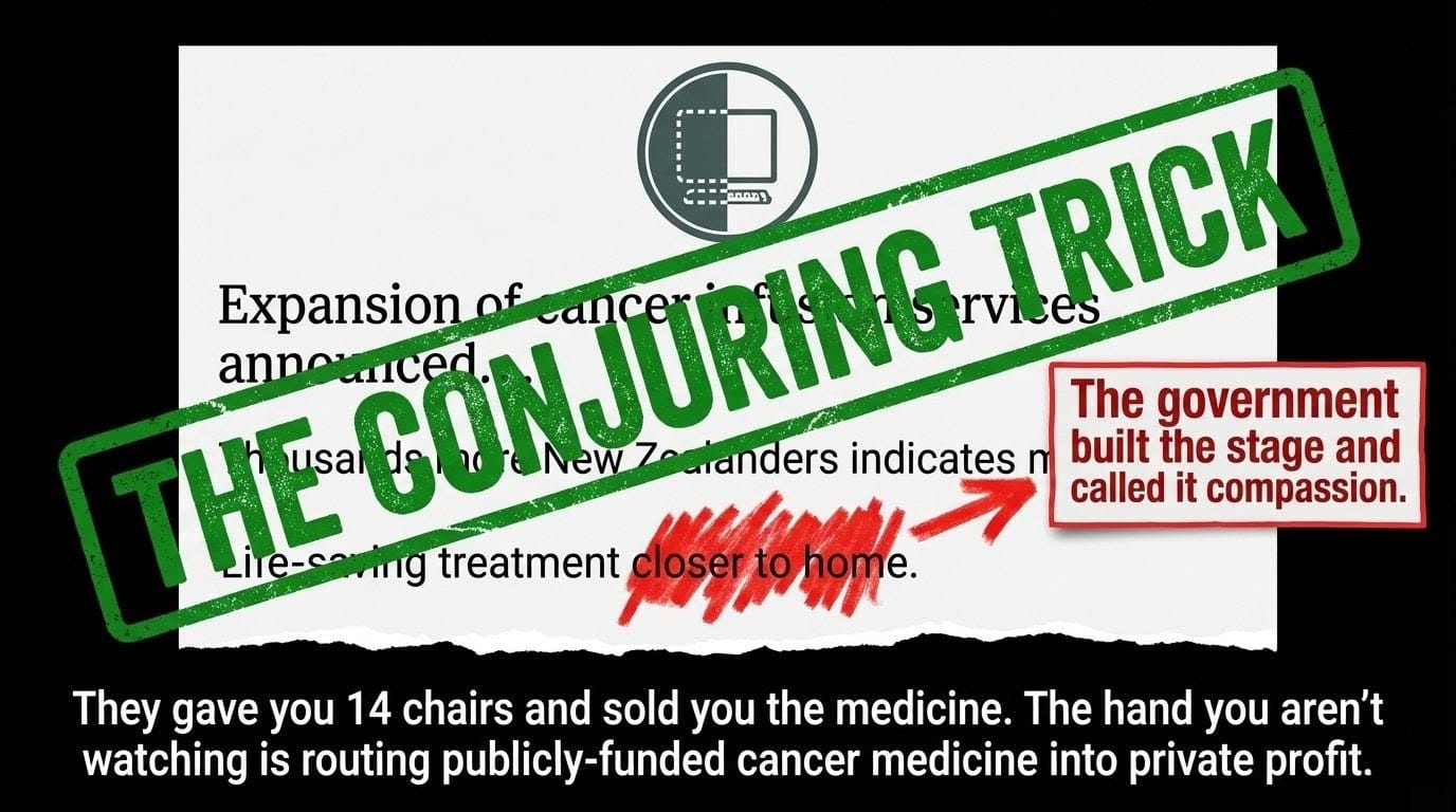 On Monday, the Health Minister stood at Waitākere Hospital and told New Zealanders he was delivering 14 new infusion centres and expansions at 14 existing sites — "hundreds" more cancer treatments a week, "thousands" more patients, "life-saving treatment closer to home," as RNZ reported. It sounds magnificent. It is a conjuring trick. And the hand that isn't being watched is the one routing publicly-funded cancer medicine into private profit, stripping Te Tiriti from health legislation, and locking in 10-year privatisation contracts that no future government will reverse without a political war.