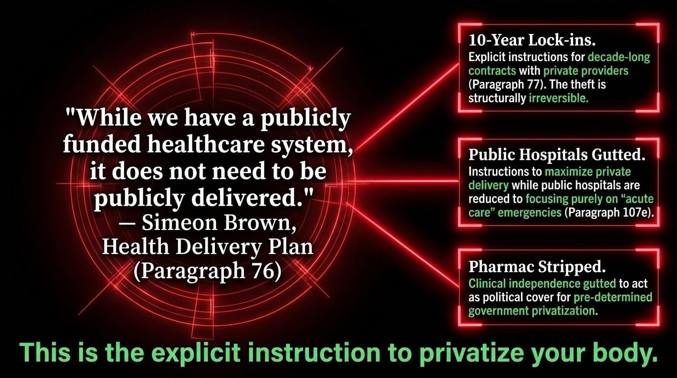 - Health NZ is being directed to sign 10-year private contracts — as Brown's Health Delivery Plan explicitly states — making this structurally irreversible.