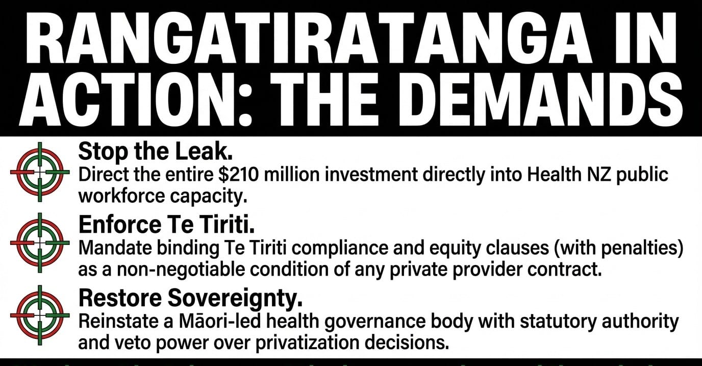 The solution: Immediately audit the ethnic composition of patients accessing cancer treatment through private providers receiving public funding. Require all 10-year outsourcing contracts to include binding equity clauses with penalties for underrepresentation of Māori and Pasifika. Reinstate a Māori-led health governance body with statutory authority to veto privatisation decisions that breach Te Tiriti.