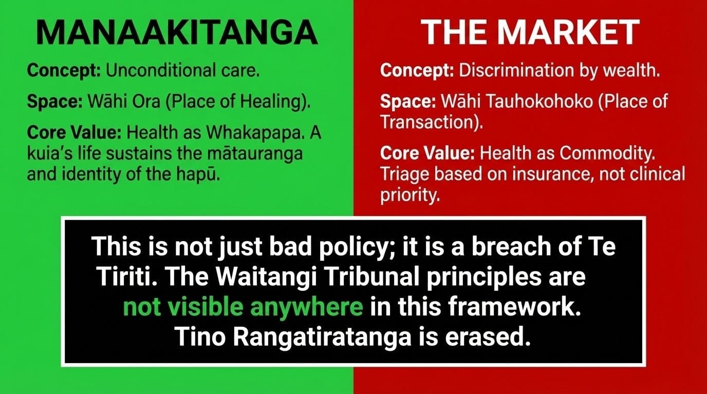 What this means for tikanga: Imagine your grandmother gets cancer. She can see the new infusion clinic from her window — but it only takes patients with Southern Cross insurance. She waits six months in the public queue while the private clinic runs at 70% capacity. That is not access. That is theatre. In tikanga terms, this violates manaakitanga — the sacred duty of unconditional care that does not discriminate by wealth. When the state converts health into a market, it turns a wāhi ora into a wāhi tauhokohoko — a place of transaction — destroying the mauri of the system itself.