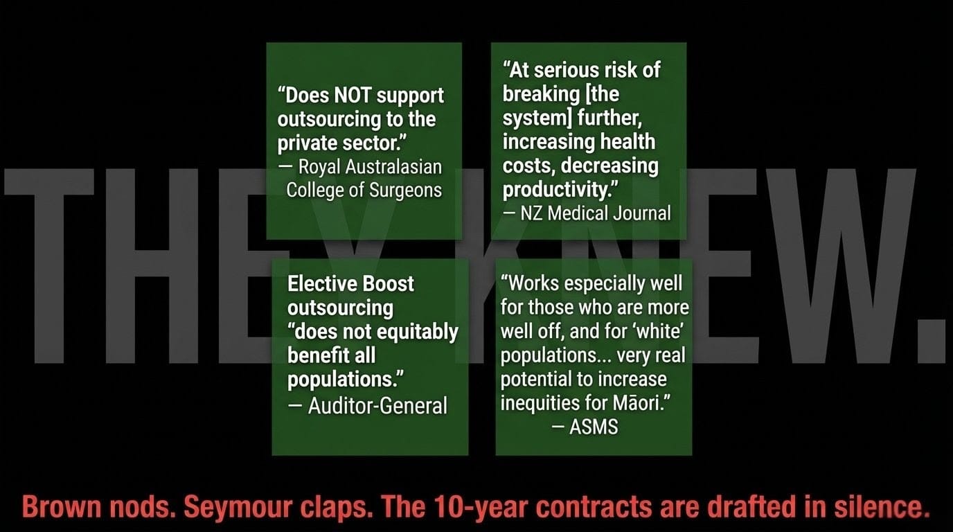 RACS. NZMJ. Green Party. ASMS. Auditor-General. All saying the same thing. Brown nods. Seymour claps. The 10-year contracts are drafted in silence.