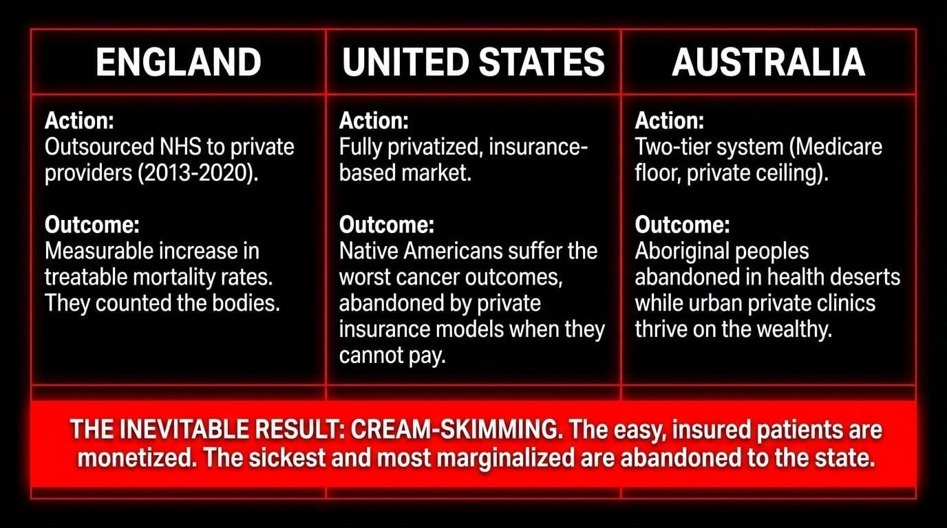 The United States built the world's most comprehensively privatised healthcare system. It spends more per capita on health than any comparable nation. Native Americans — Indigenous peoples with a colonial dispossession history directly parallel to Māori — have among the worst cancer outcomes of any population group in the country. They are diagnosed later. They are treated less. They die sooner. The private insurance-based system abandons them when they cannot pay. This is not a failure of the American private health model. It is its logical outcome.