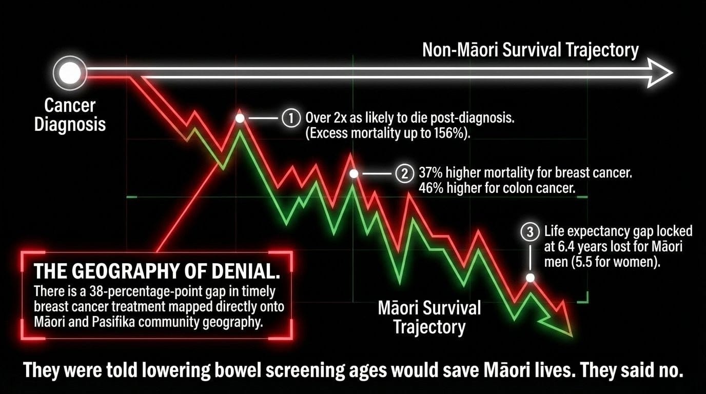 - The Breast Cancer Foundation's own data confirms a 38-percentage-point gap in timely treatment mapped directly onto Māori geography.