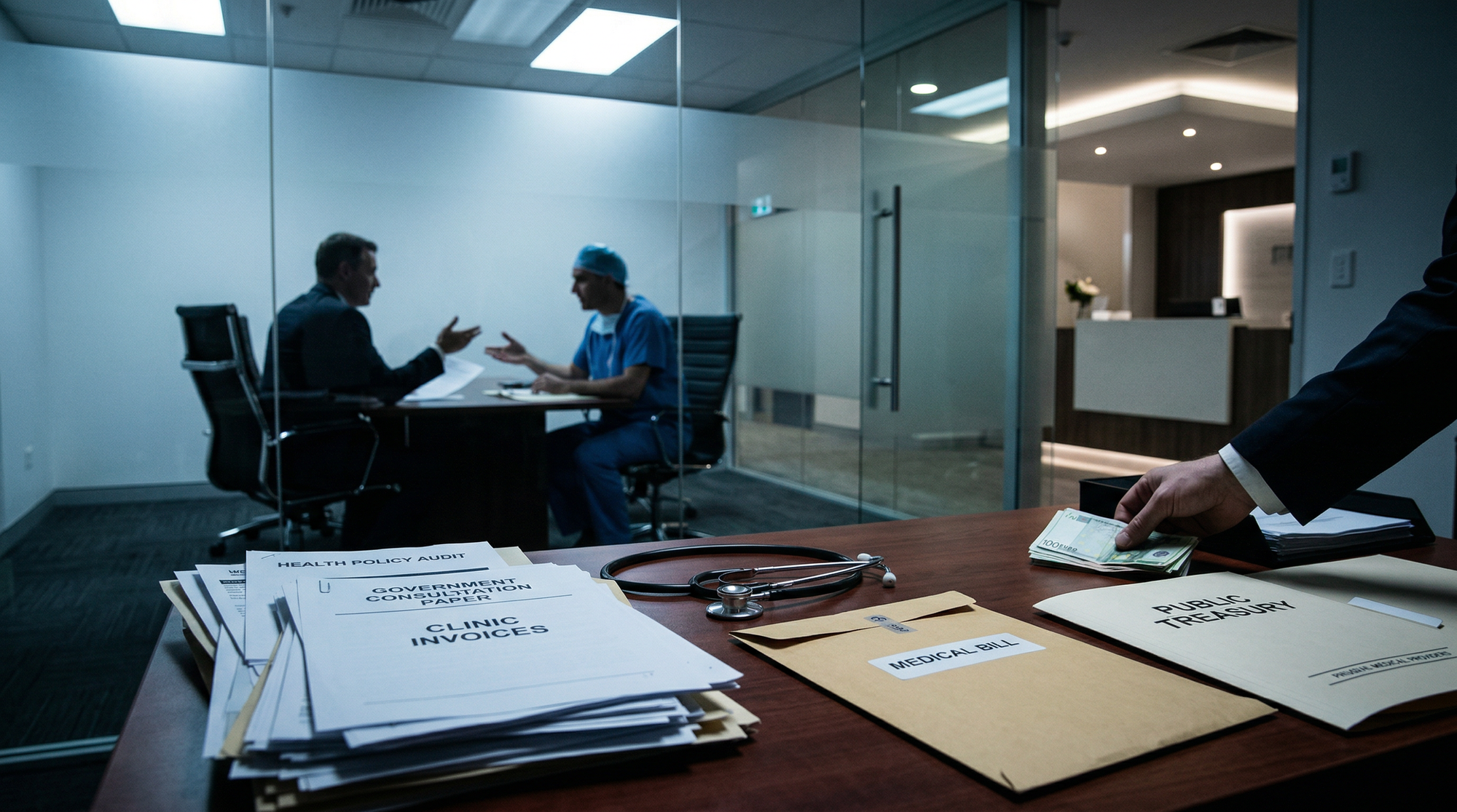 There it is. Fourteen words. The entire architecture of this government's health policy. Public money. Private delivery. Your taxes build the clinic. A shareholder takes the dividend.