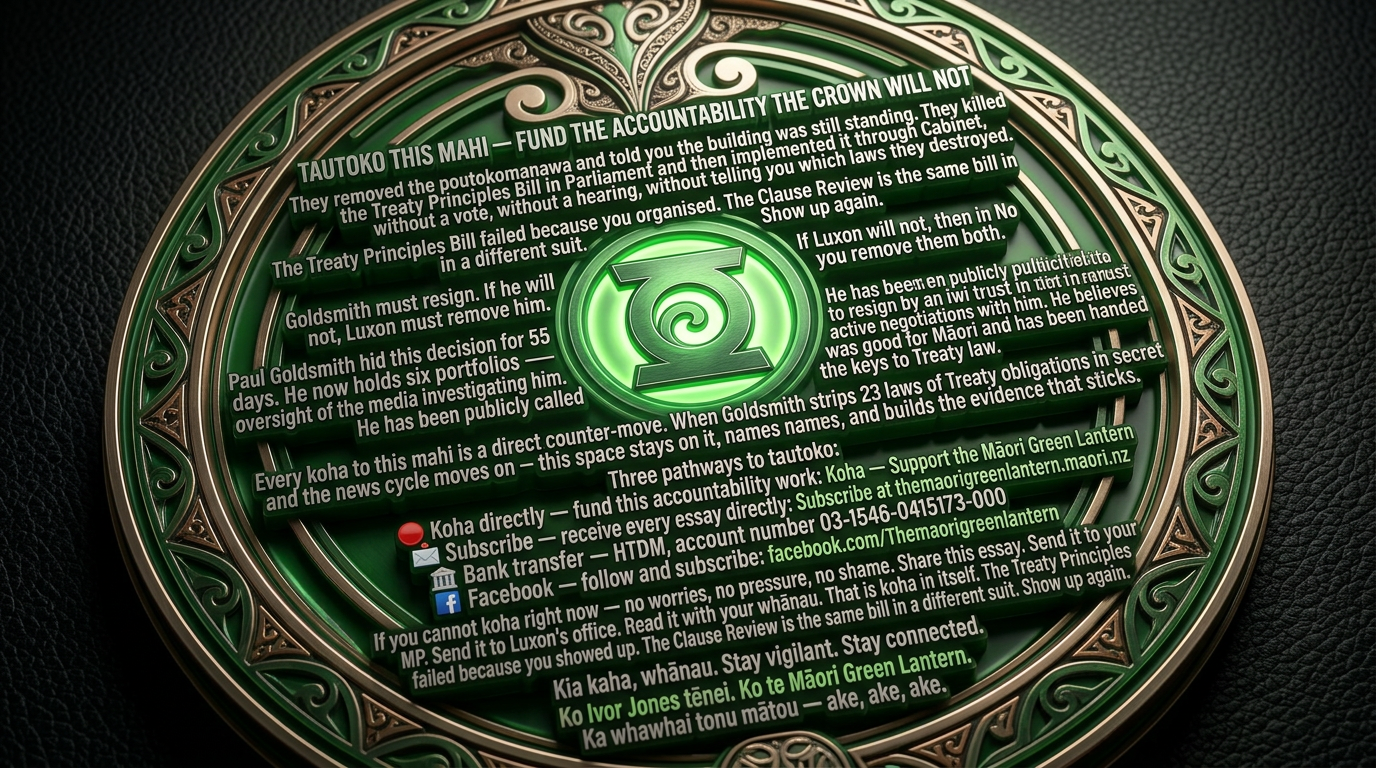 Every koha to this mahi is a direct counter-move. When Goldsmith strips 23 laws of Treaty obligations in secret and the news cycle moves on — this space stays on it, names names, and builds the evidence that sticks.