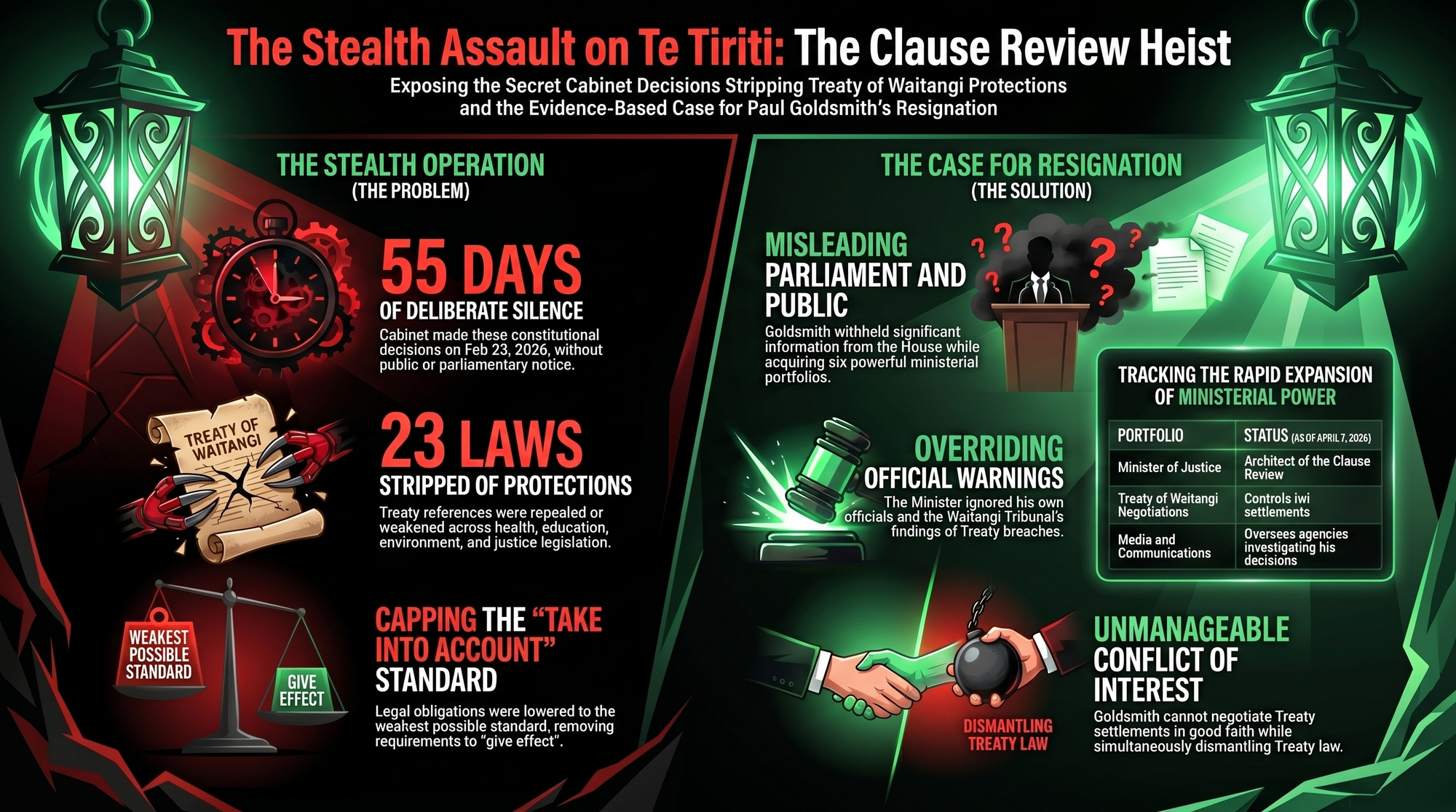 One man. Six portfolios. He negotiates the Treaty. He oversees justice. He controls the public service. He manages the media. He owns the cultural institutions. And he is simultaneously stripping Treaty obligations from 23 laws while hiding which ones.