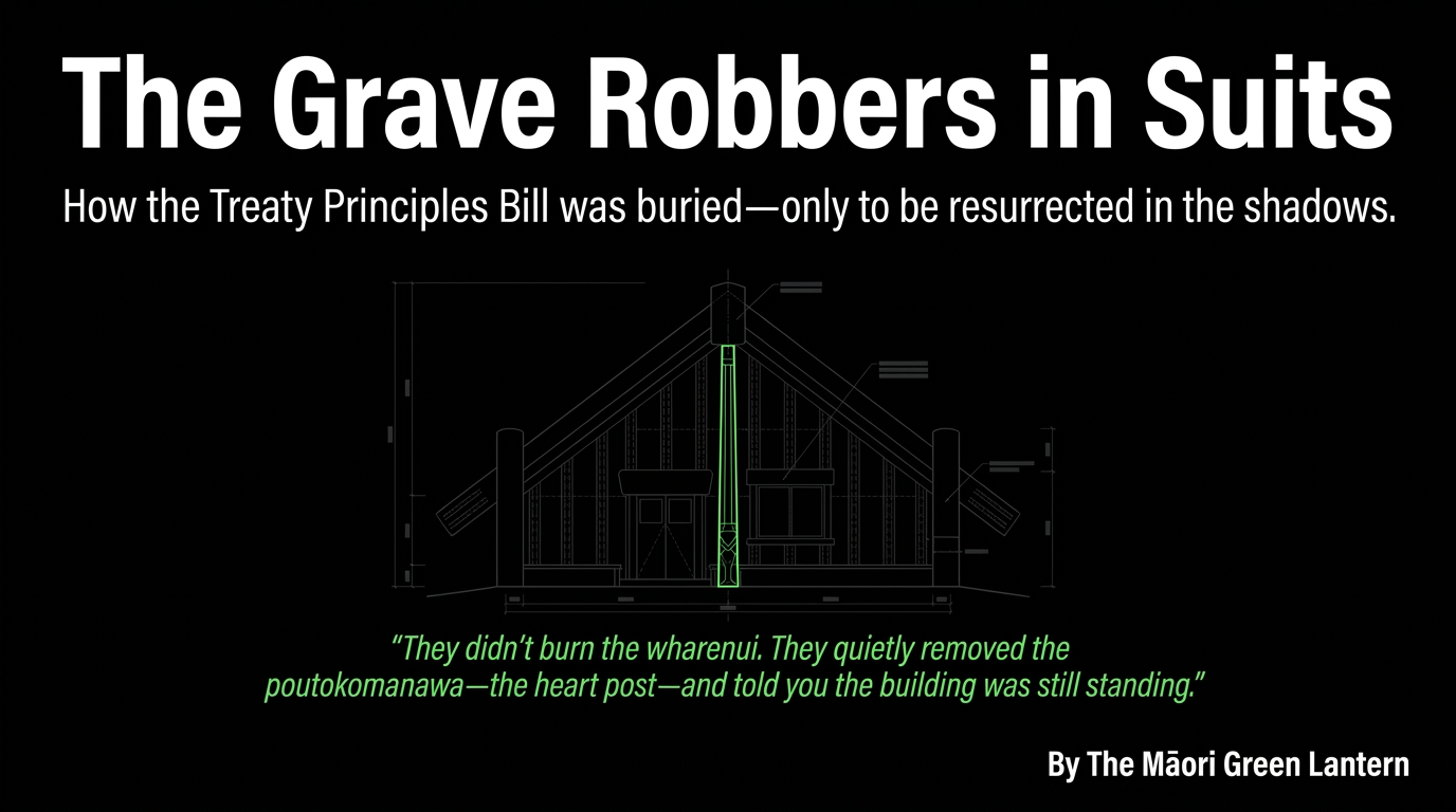Here is the truth: the Treaty Principles Bill and the Treaty Clause Review were always two prongs of the same spear. As The Māori Green Lantern first documented in The Treaty Principles Bill: A Neoliberal Dagger in the Heart of Aotearoa's Future, both emerged from the same coalition agreement, both were designed to reduce Māori legal leverage, and both were driven by the same ideological engine: NZ First's Shane Jones and ACT's David Seymour, with National providing the parliamentary machinery.