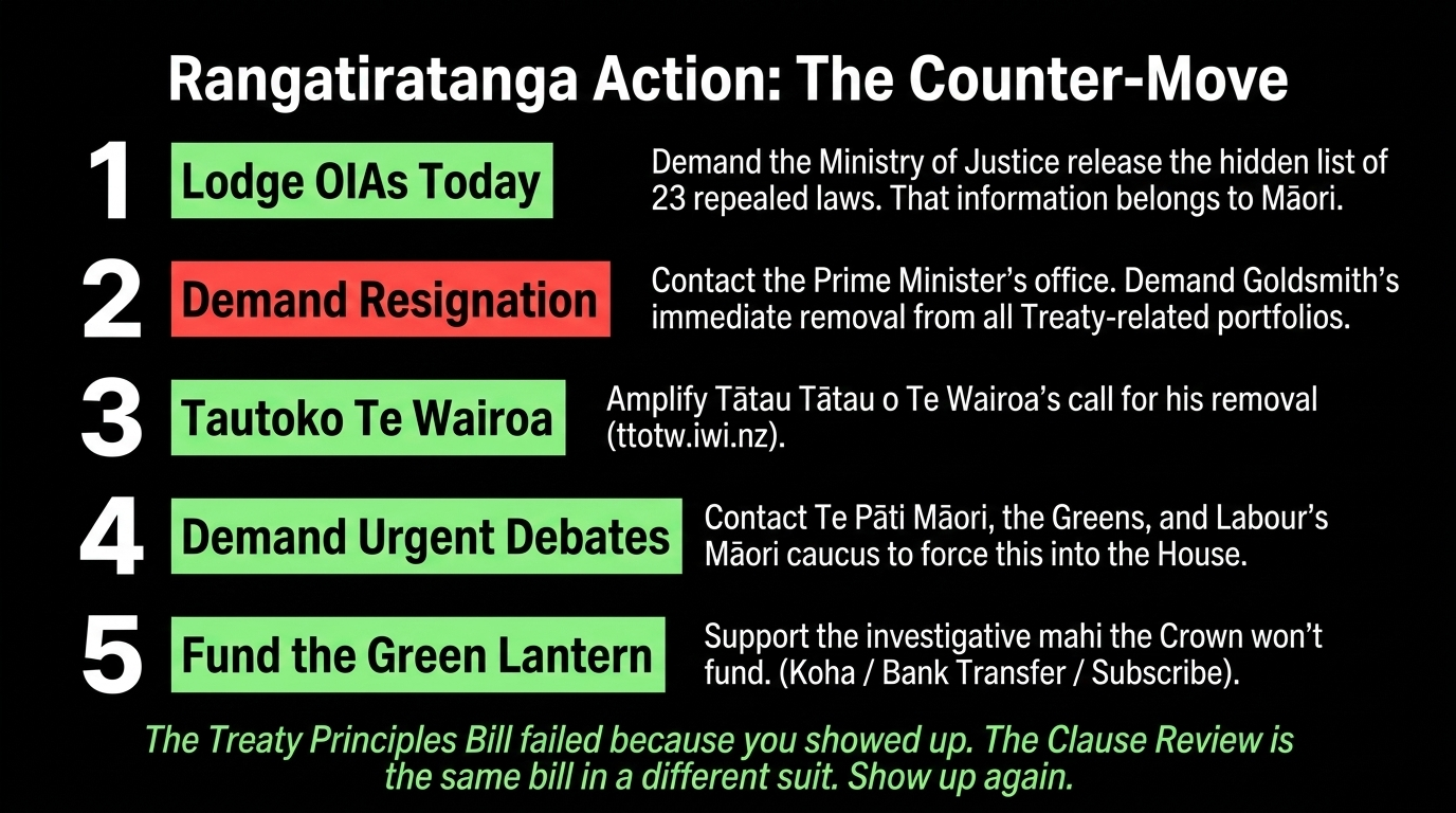 And as The Māori Green Lantern documented in The Taiaha Strikes: How New Zealand's Far Right Weaponised a Bathroom Break to Wage War on the Judiciary, Goldsmith served as Acting Attorney-General overseeing the unprecedented judicial conduct panel convened against Judge Ema Aitken — a Māori judge targeted after overhearing Winston Peters making demonstrably false claims about tikanga law. A minister who weaponises judicial removal proceedings against a Māori judge for reacting to political disinformation — while simultaneously stripping the Treaty obligations that same judge and her colleagues interpret — has demonstrated the full spectrum of this government's intent.