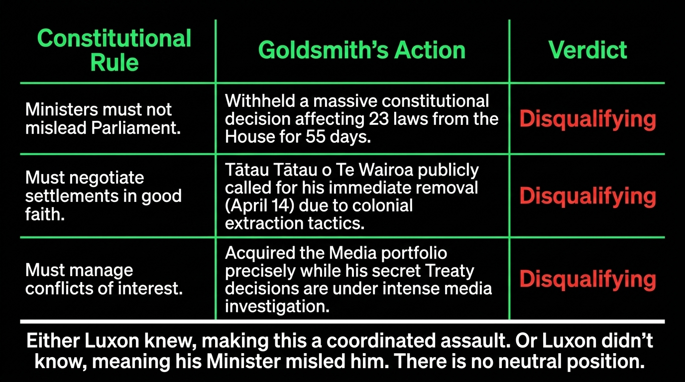 New Zealand's constitutional conventions are unambiguous. As Te Ara's Cabinet Government documentation confirms, grounds for ministerial resignation include "misleading the prime minister, one's cabinet or parliamentary colleagues, or Parliament itself." Goldsmith made a Cabinet decision on February 23 that stripped Treaty obligations from 23 laws. Parliament sat for 55 days. Question Time ran. Māori MPs asked questions about Treaty policy. Not once did Goldsmith inform the House.