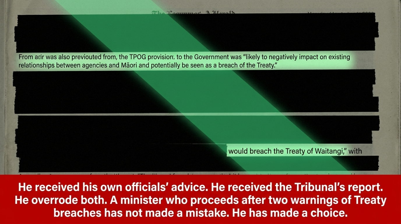Then the Waitangi Tribunal — a statutory Crown body — formally found in October 2025 that the process "would breach the Treaty of Waitangi," violating six Treaty principles, as Newsroom reported. Goldsmith received the Tribunal's report. He received his own officials' advice. He overrode both and proceeded to a Cabinet decision that was hidden for 55 days.