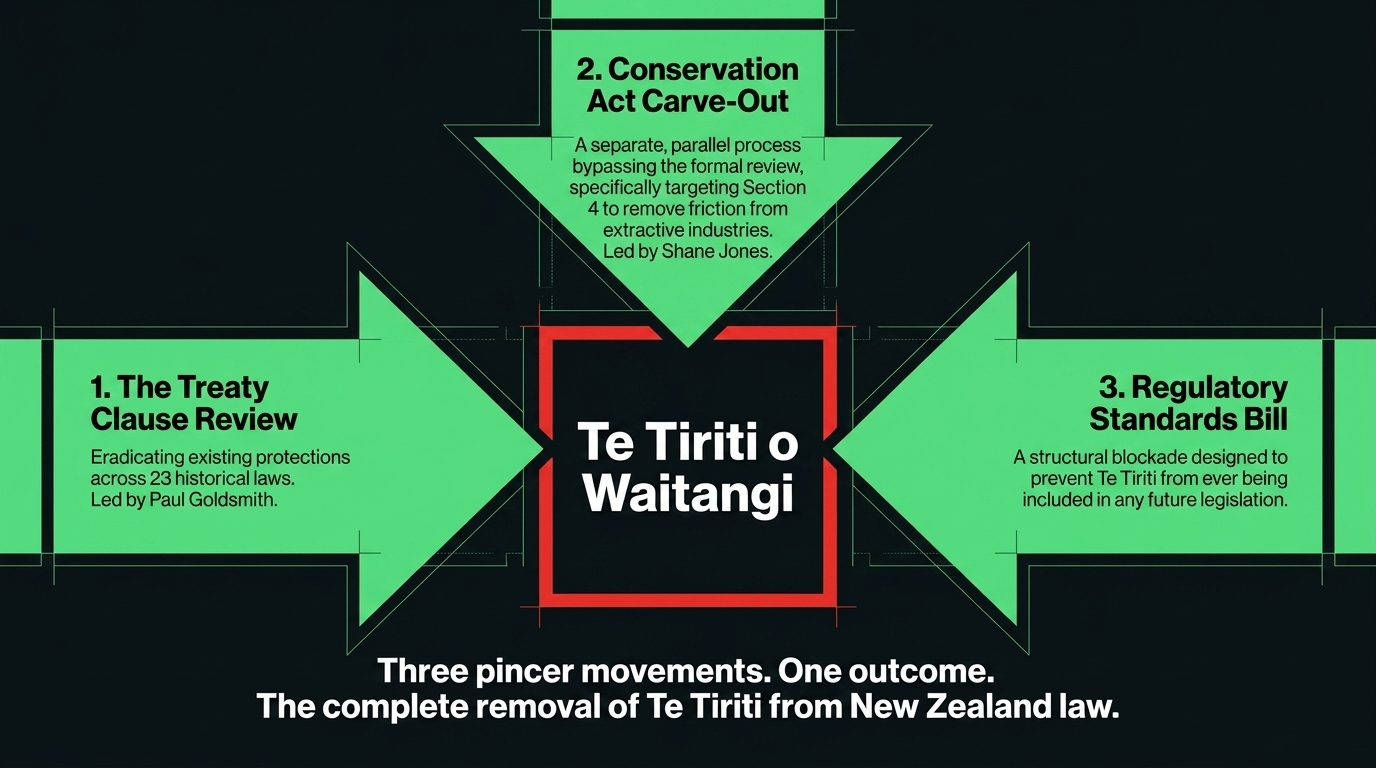 Connection 5: The Regulatory Standards Bill Runs the Third Prong. While this review strips existing Treaty clauses, the Regulatory Standards Bill — as documented by The Spinoff — removes Te Tiriti from the framework governing all future legislation. Past protections stripped through the clause review. Future protections blocked through the Regulatory Standards Bill. Present protections weakened through the Conservation Act parallel process. Three pincer movements. One outcome. The complete removal of Te Tiriti from New Zealand law.