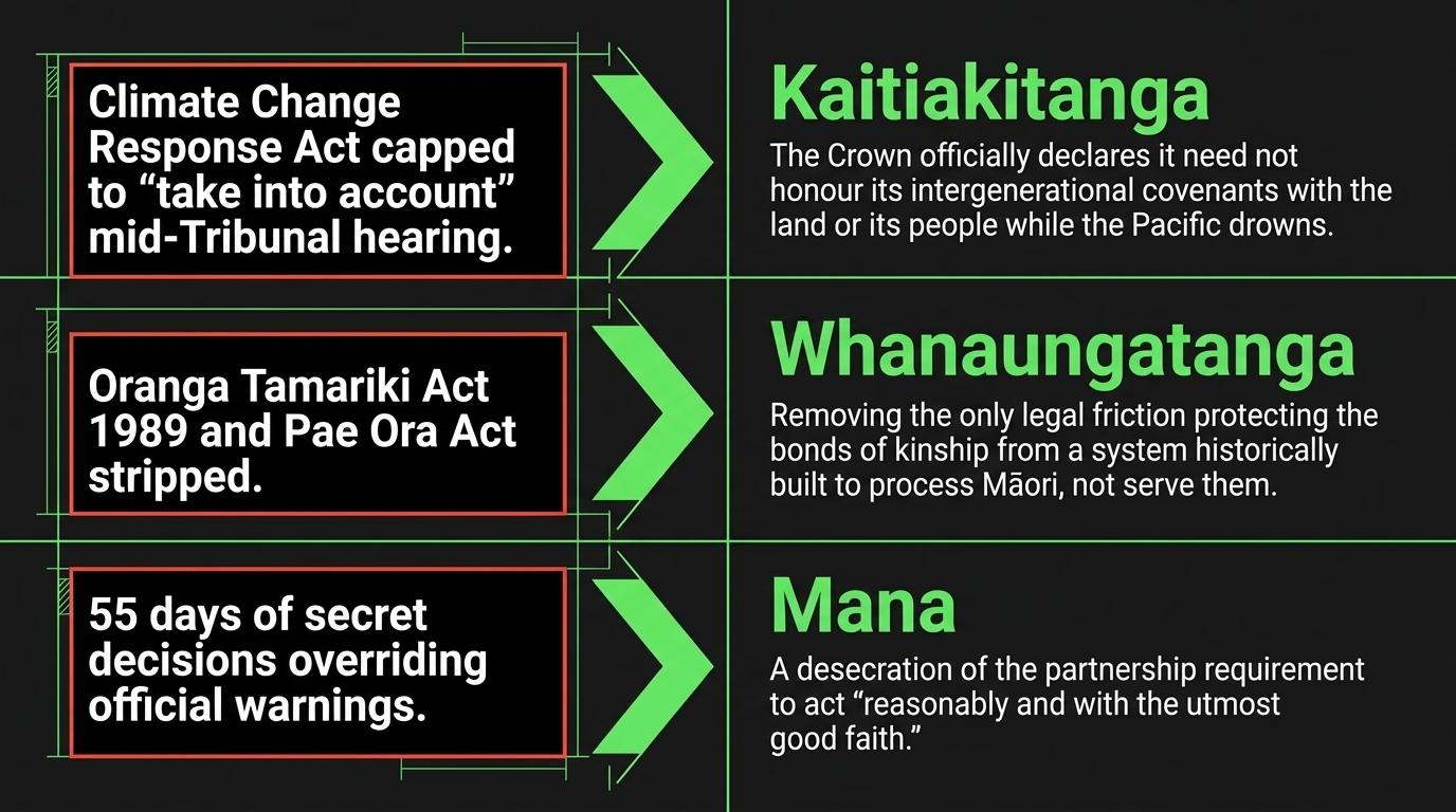 The tikanga dimension: Kaitiakitanga — guardianship of the natural world for future generations — is an intergenerational covenant, not a preference. As previously examined in Heather Cox-Richardson — Te Taiaha o te Aroha: The Weapon They Cannot Confiscate, capping a minister's Treaty obligation to "take into account" while the Pacific drowns is the Crown officially declaring it need not honour its covenants with the land or its people.