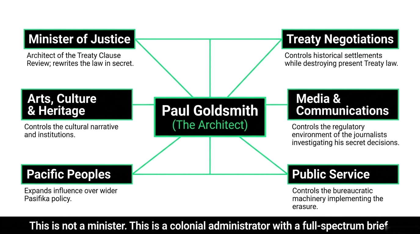 The pattern is not subtle. It is a programme. And Goldsmith is not a cog. He is the architect — and as of April 7, he runs six portfolios giving him control of law, settlements, public service, media, culture, and Pacific communities.