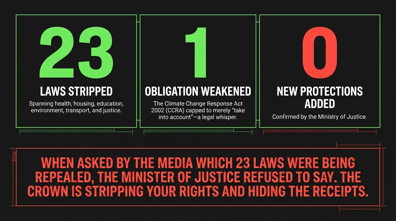 The Justice Minister of New Zealand agreed to strip Te Tiriti protections from the laws governing your health, your children's schooling, your climate future, and your whenua — and will not tell you which ones.