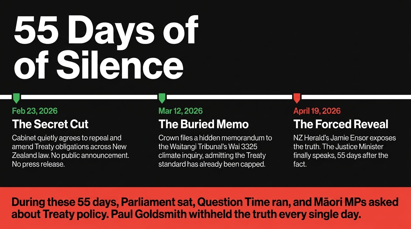 The NZ Herald found out — not from a government press release — but from a Crown memorandum buried in Waitangi Tribunal filings, filed on March 12, 2026. Fifty-five days. That is how long Paul Goldsmith sat on a constitutional decision affecting every Māori in this country and said nothing.