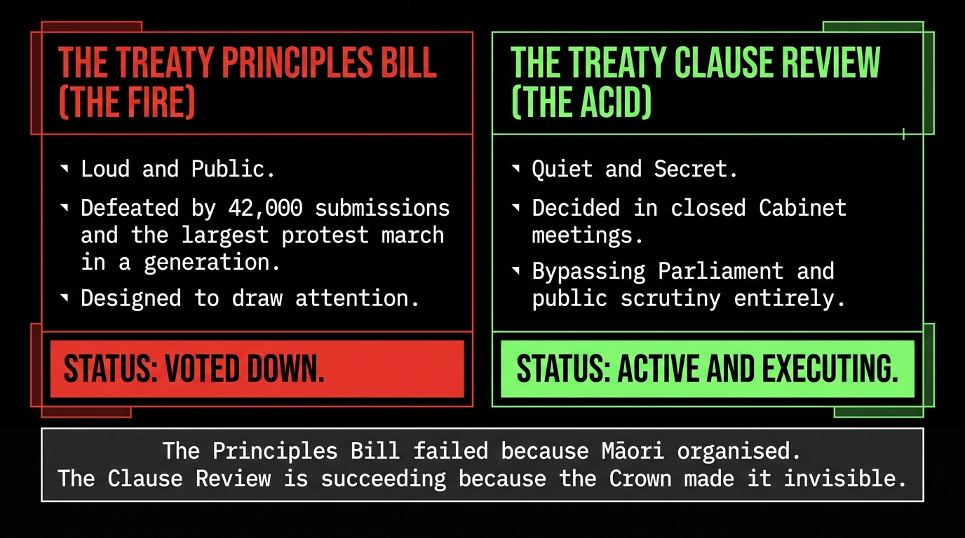 The Principles Bill failed because Māori organised. The Clause Review is succeeding because the Crown made it invisible.