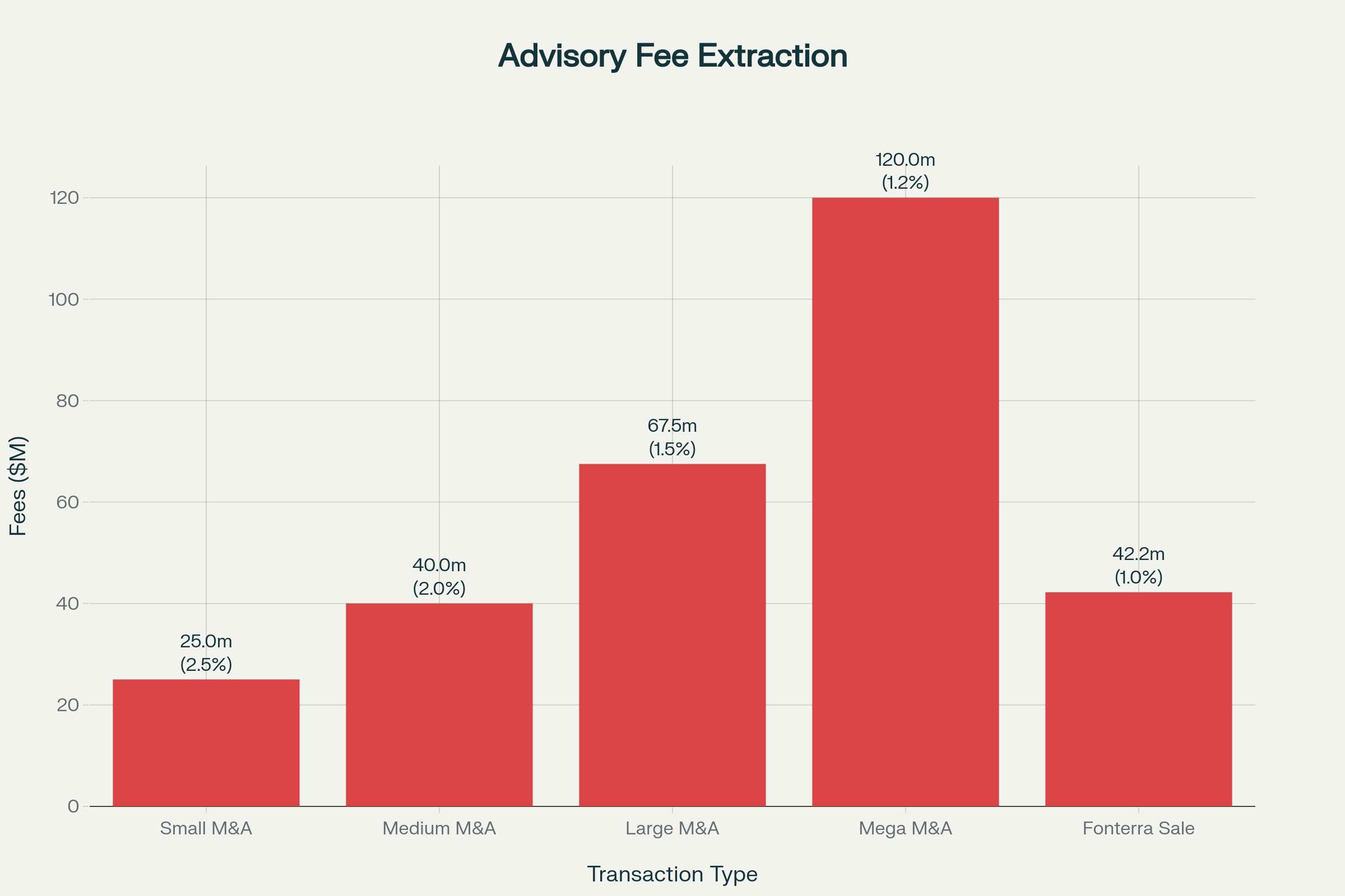 Estimated advisory fees extracted from different sized M&A transactions, highlighting the $42+ million fee harvest from Fonterra's sale