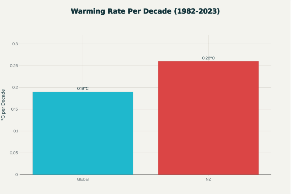 - 34% FASTER: According to the Guardian, New Zealand’s ocean warming rate is stripping the skin off our marine ecosystems. While the world warms at ~0.19°C per decade, our waters are surging at 0.26°C per decade. The Our Marine Environment 2025 report published by the New Zealand government confirms this rate, driven partly by circulation changes in the Southwest Pacific.