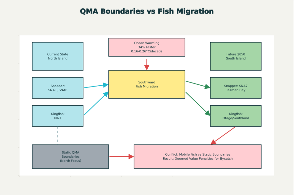 The Quota Management System (QMS) is a colonial cage. It draws static lines on a map for fish that no longer live there. As snapper and kingfish flee south to escape the heat, the quota rights Māori fought 150 years to reclaim are becoming “paper fish”—rights to empty water.