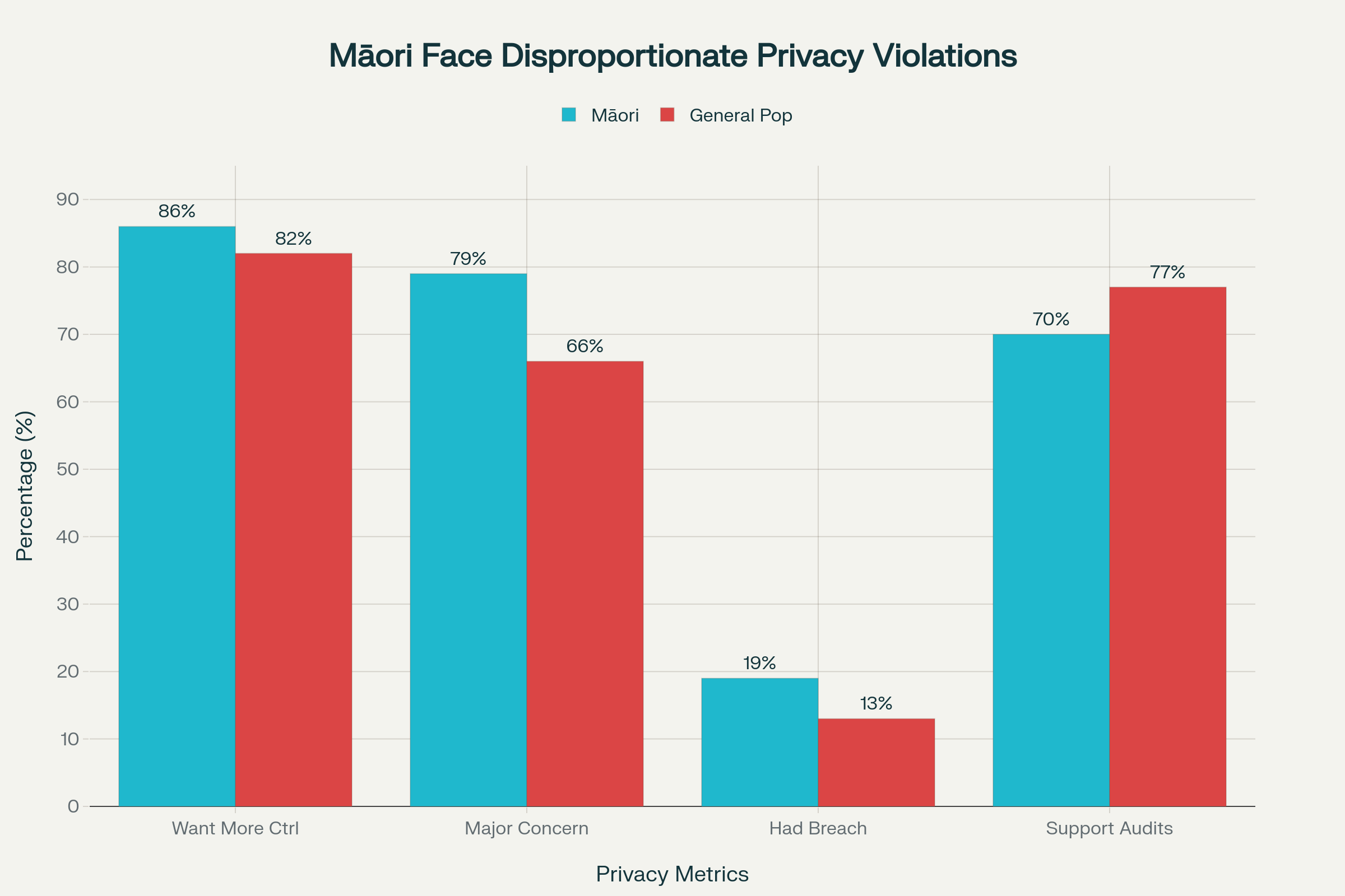 This isn't happening in a vacuum. As tangata whenua, we know this surveillance apparatus disproportionately targets our communities. The data is clear: Māori experience privacy breaches at 19% compared to 13% for the general population. We express major privacy concerns at 79% compared to 66% for others.