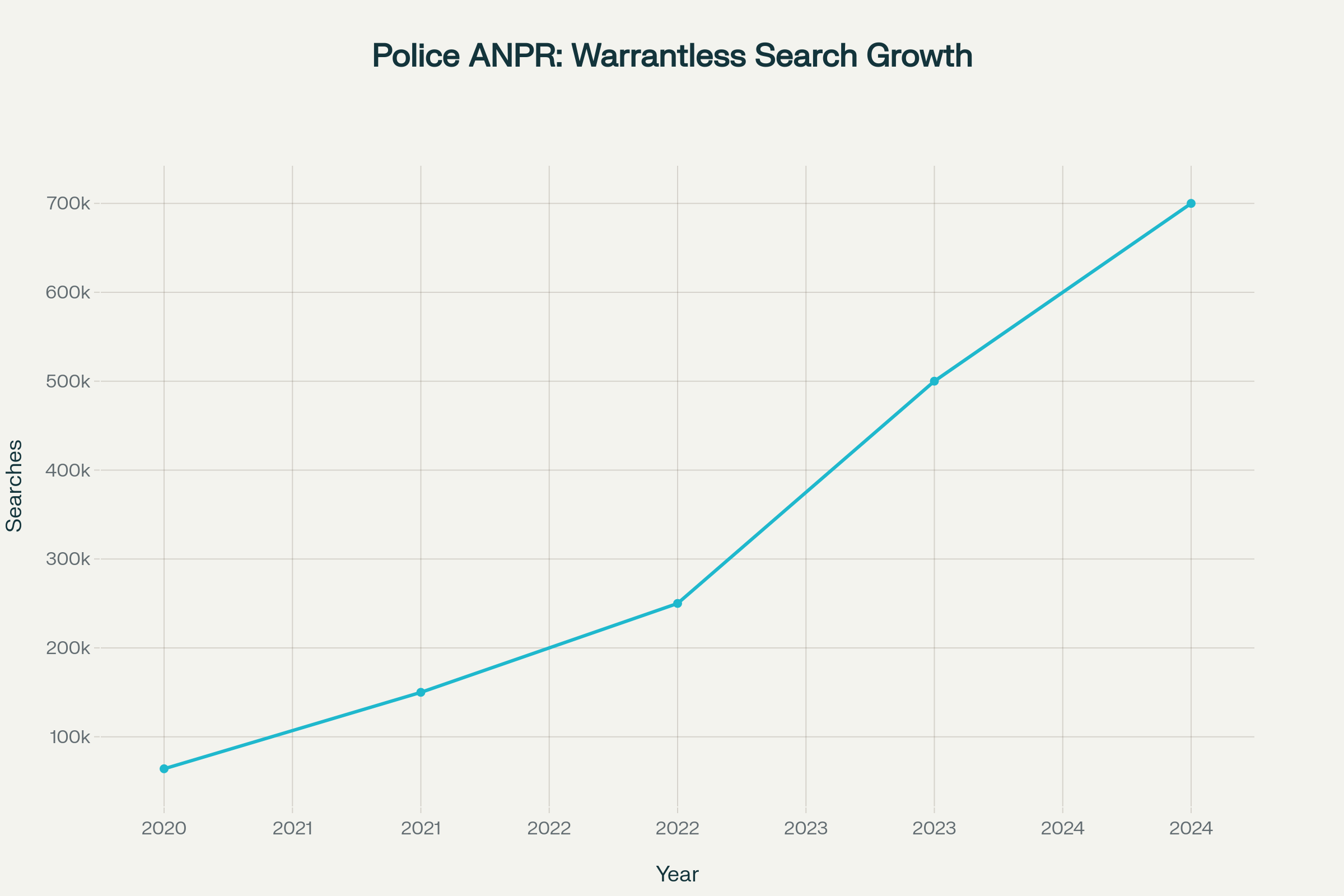 Police ANPR surveillance searches have grown exponentially from 64,000 in 2020 to 700,000 in 2024, with over 8,600 officers now having warrantless access to track any vehicle's movements over 60 days