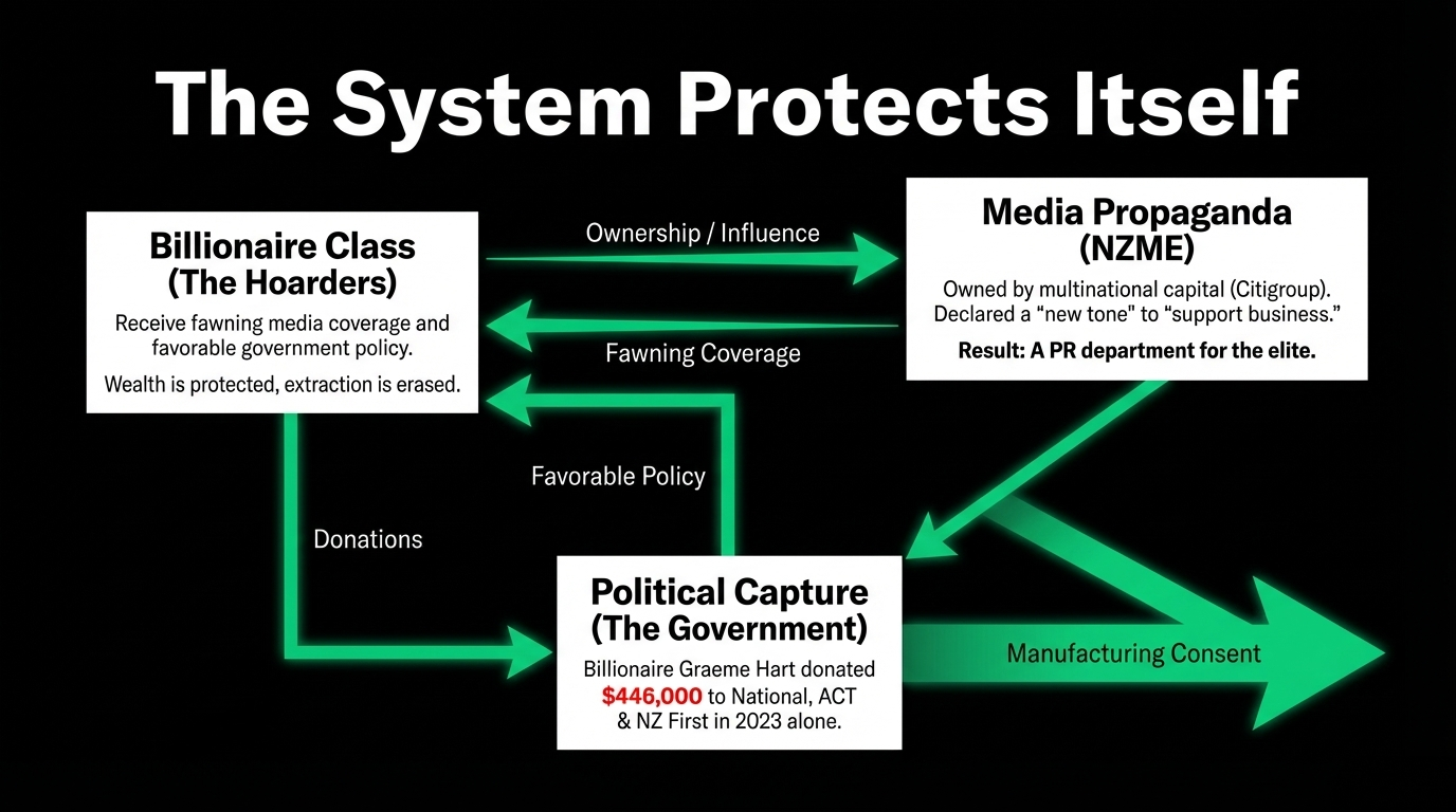 RNZ documented that political donations in New Zealand have more than tripled, with the wealthy concentrating influence over policy. Hart’s donations buy access, favorable regulation, and protection from wealth taxation. This is how oligarchy works: capital buys the state, then uses state power to protect capital accumulation.