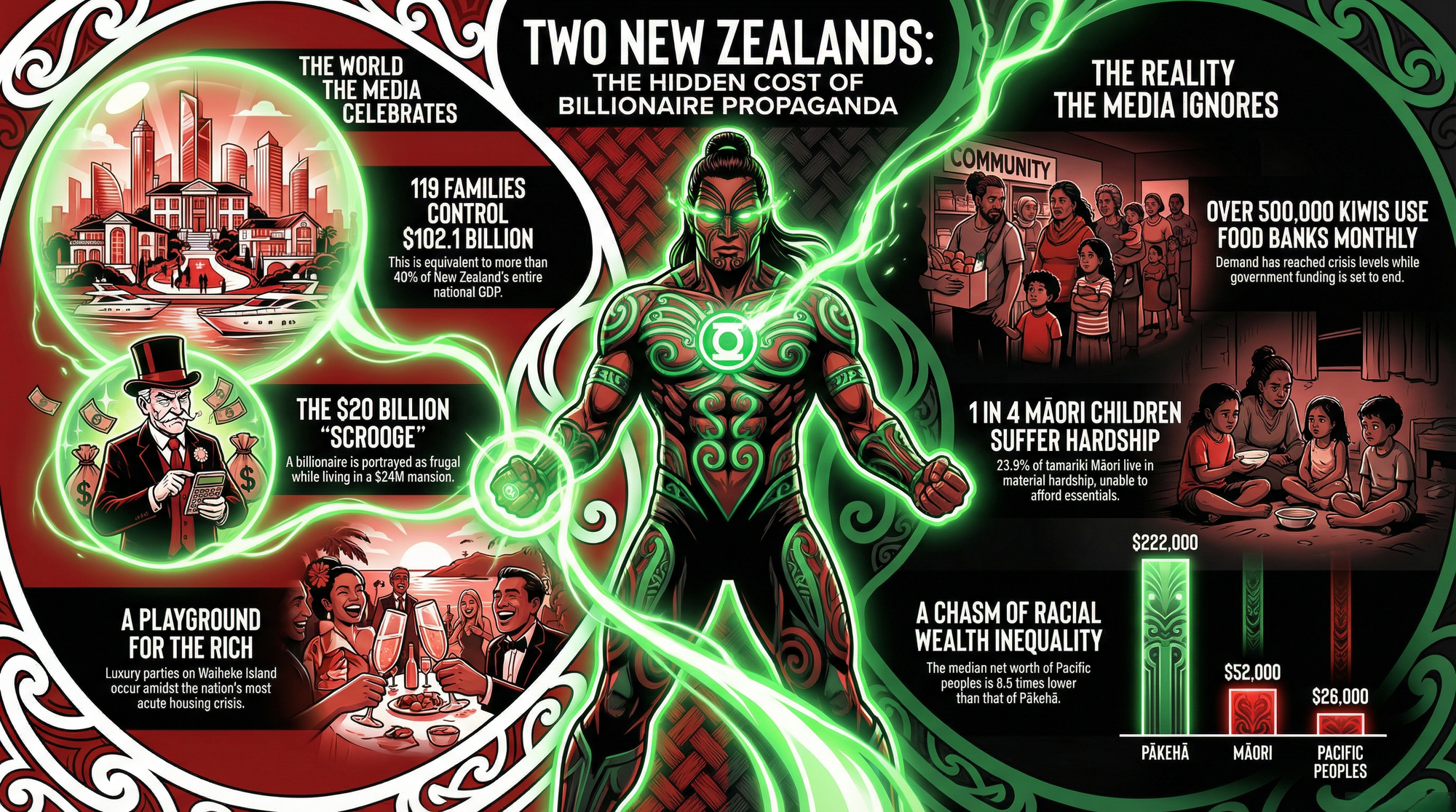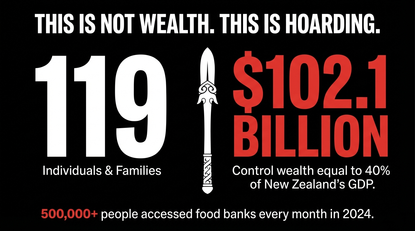 These weren’t isolated puff pieces. They represent NZME’s systematic project to manufacture consent for a system of extraction so obscene that 119 individuals and families now control $102.1 billion—equivalent to more than 40 percent of New Zealand’s entire GDP. This concentration of wealth sits atop a nation where over half a million people accessed food banks every month in the second half of 2024, where 23.9 percent of tamariki Māori live in material hardship, and where the median net worth of Pacific peoples ($26,000) is 8.5 times lower than that of Pākehā ($222,000).