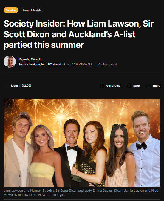 On January 8, 2026, the New Zealand Herald published two pieces of propaganda masquerading as journalism. The first, by Society Insider editor Ricardo Simich, fawned over how “Kiwi A-listers and the super-rich” celebrated New Year’s Eve, detailing Sir Scott Dixon’s knighthood party on Waiheke Island, billionaire Nick Mowbray’s private jets, and American tech multi-billionaire Matthew Prince’s $5.5 billion fortune. The second, a 16-minute “Lunch with...” profile by Editor-at-Large Shayne Currie, humanized Anna Mowbray—part of New Zealand’s richest family worth $20 billion—through tales of confiscating her child’s $50 tennis racquet while living in a $24 million waterfront mansion.