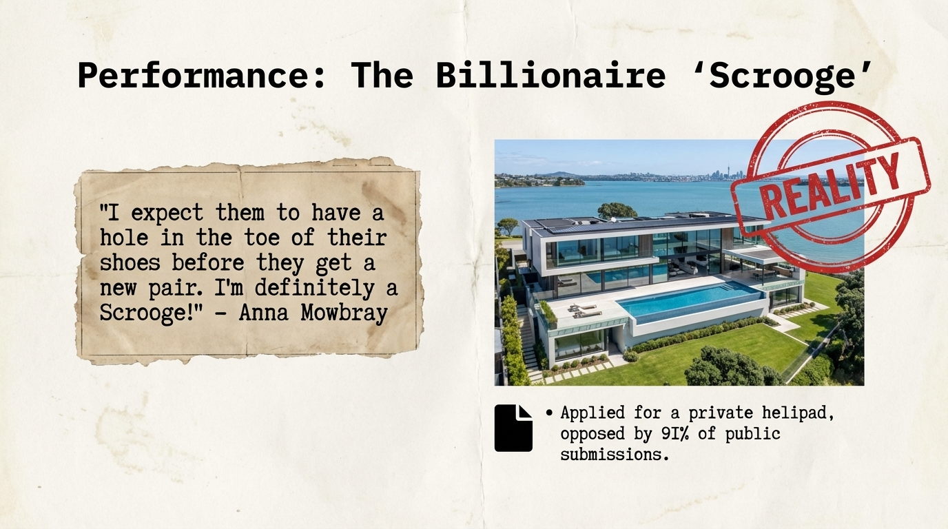 Anna Mowbray’s “I’m definitely a Scrooge!” persona is the most insidious form of wealth propaganda: the billionaire who claims frugality while living in obscene luxury.