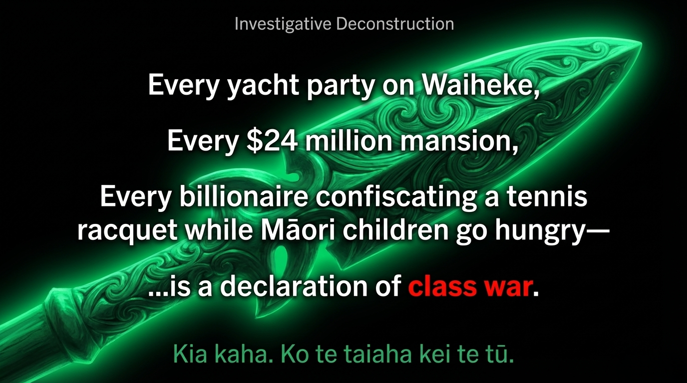 Until then, every yacht party on Waiheke, every $24 million mansion with a private helipad application, every “Scrooge” billionaire confiscating tennis racquets while Māori children go hungry—is a declaration of class war.