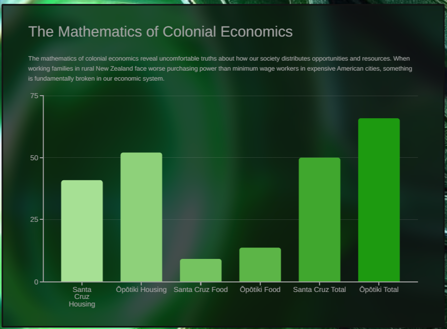 The mathematics of colonial economics reveal uncomfortable truths about how our society distributes opportunities and resources. When working families in rural New Zealand face worse purchasing power than minimum wage workers in expensive American cities, something is fundamentally broken in our economic system.