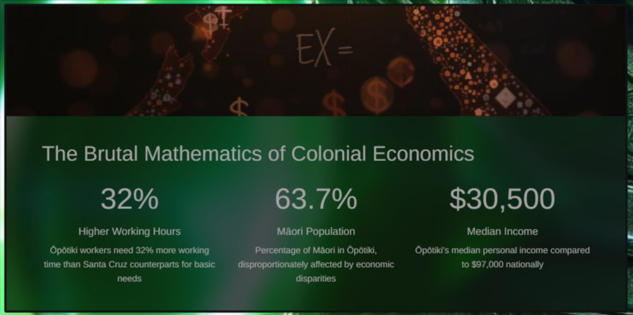 Ōpōtiki represents thousands of communities across Aotearoa where economic colonisation operates most brutally. With 7.3% unemployment compared to national averages and 44% of working age people earning $20,000 or less annually, the town exemplifies how neoliberal policies abandon rural and Māori communities.